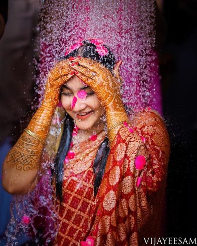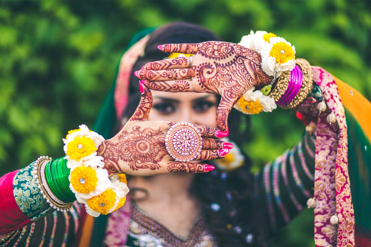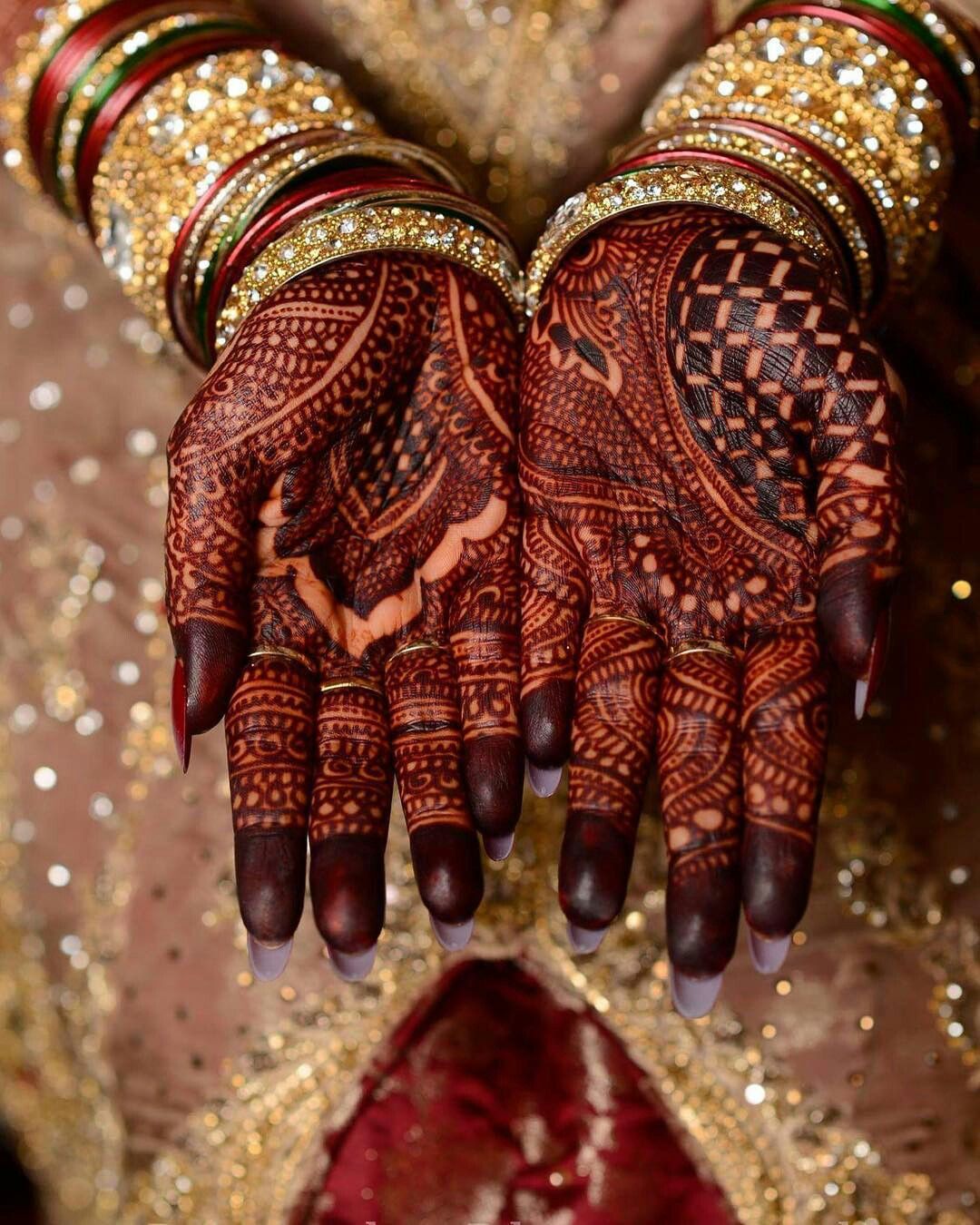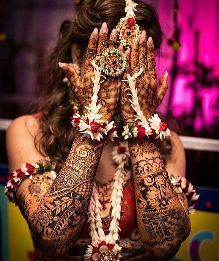 Bridal mehndi, or henna designs, are often applied in India. Mehndi, also called a henna tattoo, is a traditional temporary skin decoration using henna that is often applied for weddings in India, Morocco, or Pakistan.